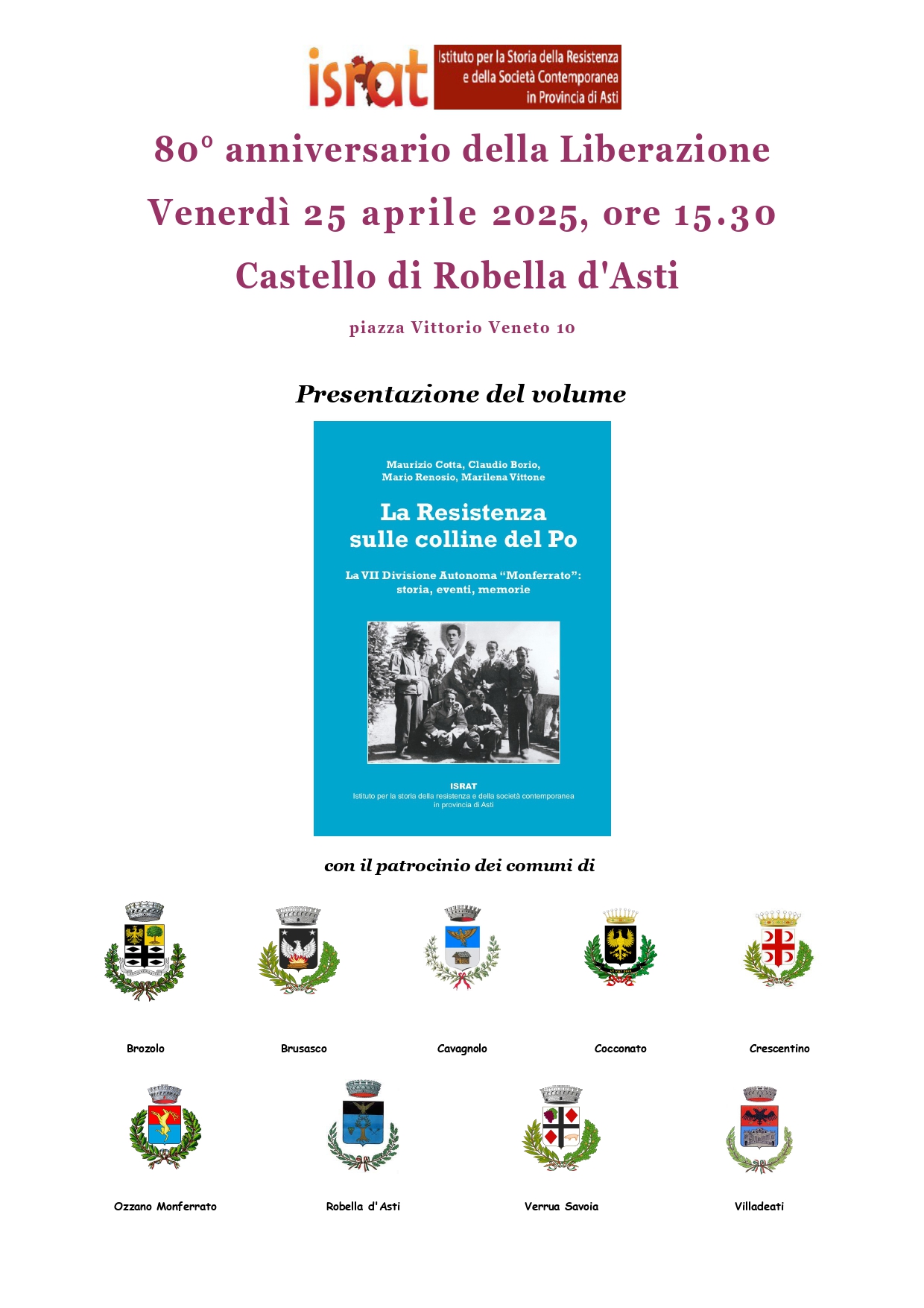 Robella - 25/04/2025 - "La resistenza sulle colline del Po" 80° anniversario della LiberazioneVenerdì 25 aprile 2025, ore 15.30Castello di Robella d'Asti - piazza Vittorio Veneto 10 Presentazione del volume"La resistenza sulle colline del Po"