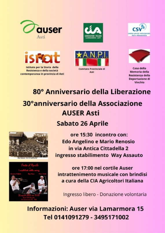 Asti - 26/04/2025 - 30° anniversario Associazione AUSER 80° Anniversario della Liberazione 30° anniversario Associazione AUSER Asti Sabato 26 aprile clicca sulla locandina a fianco per consultare il programma completo