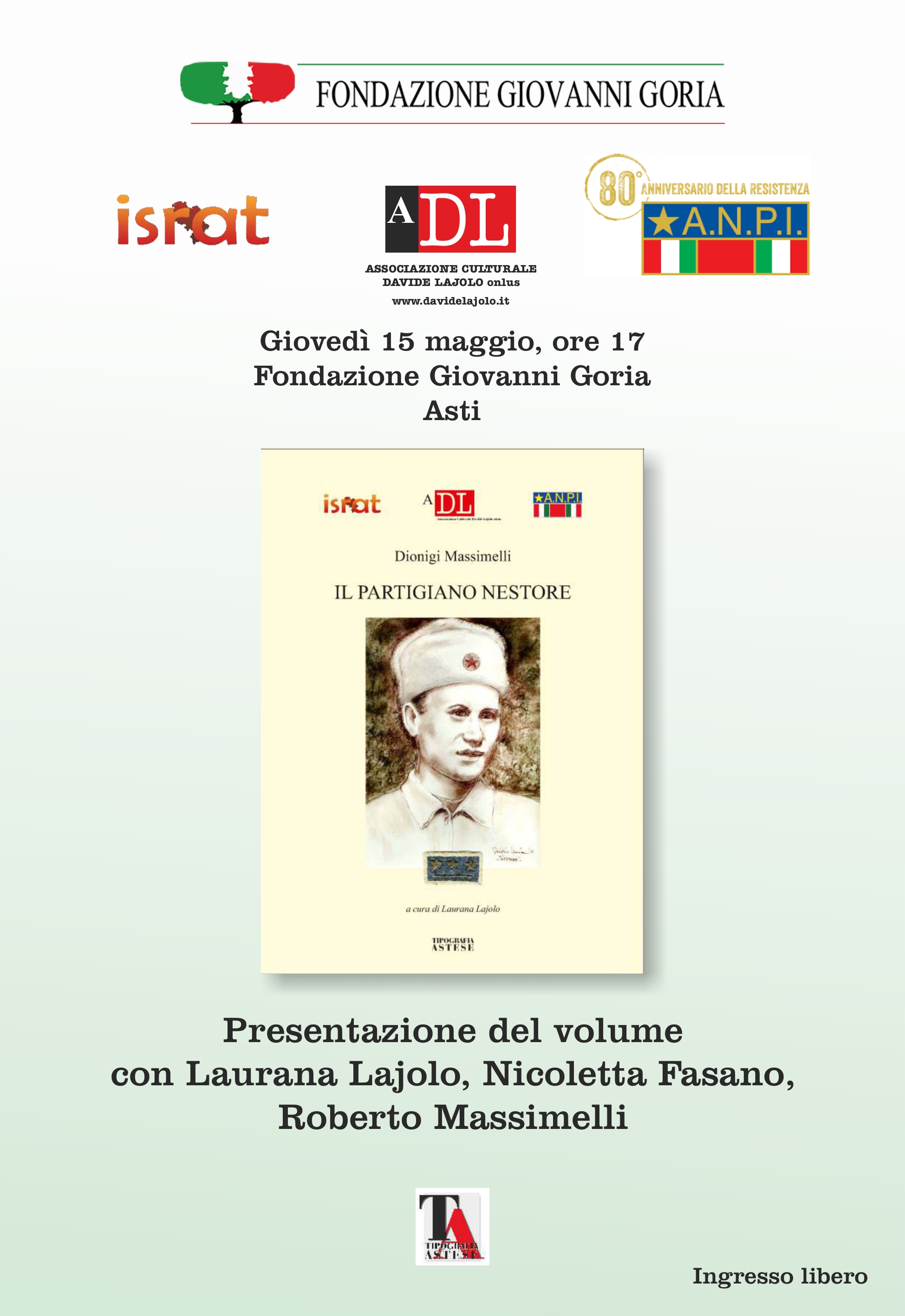 Asti - 15/05/2025 - Il partigiano Nestore Giovedì 15 maggio, ore 17Fondazione Giovanni GoriaAsti Il partigiano Nestore Presentazione del volume con Laurana Lajolo, Nicoletta Fasano, Roberto Massimelli