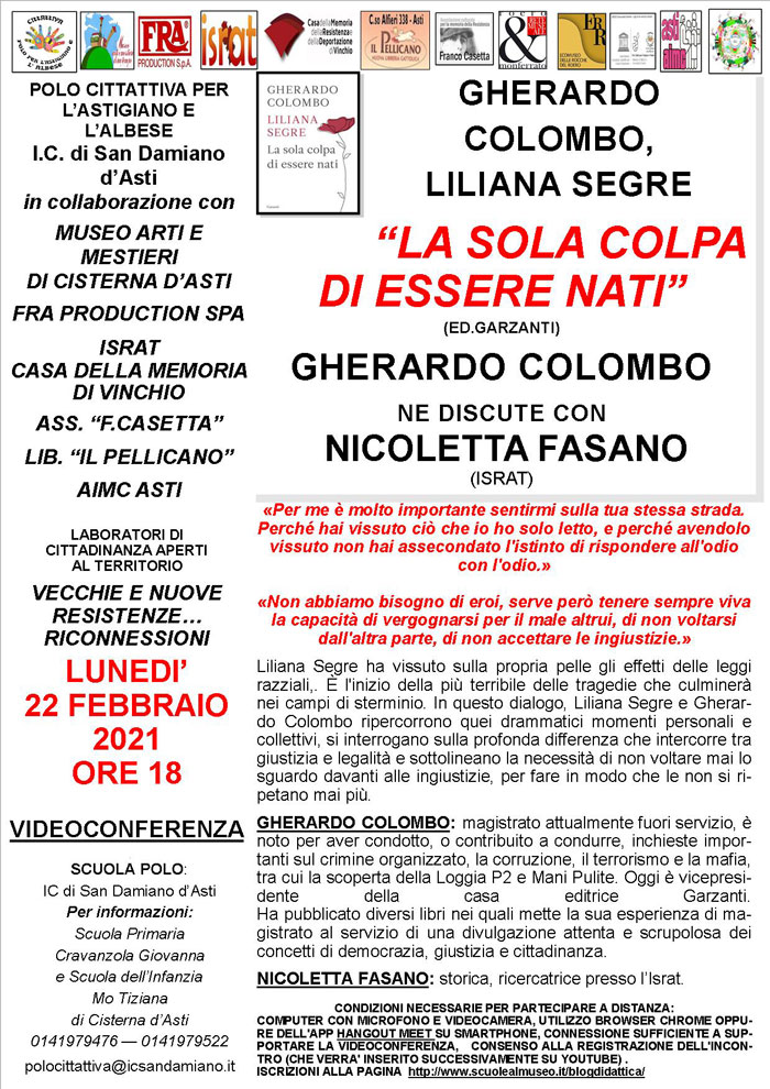 Gradito ritorno per Carlo Greppi che ha dialogato con Nicoletta Fasano (Israt) del suo ultimo libro “L’antifascismo non serve più a niente” (Ed. Laterza). La videoconferenza è stata organizzata dal Polo Cittattiva per l’Astigiano e l’Albese, Museo di Arti e Mestieri di un Tempo di Cisterna d’Asti, Israt, Associazione “F. Casetta”, Fra production srl, Cantine Povero distribuzione e Aimc Asti. Il libro inaugura la collana “Fact Checking: la storia alla prova dei fatti” diretta da Greppi per Laterza.