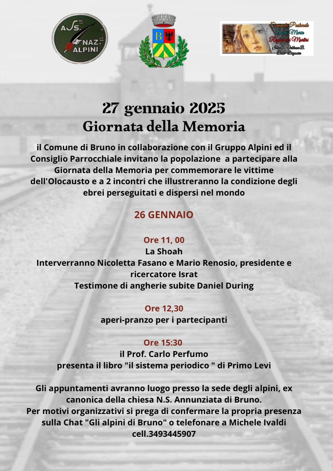 Il Comune di Bruno in collaborazione con il Gruppo Alpini ed il Consiglio Parrocchiale invitano la popolazione a partecipare alla Giornata della Memoria per commemorare le vittime dell'Olocausto e a 2 incontri che illustreranno la condizione degli ebrei perseguitati e dispersi nel mondo