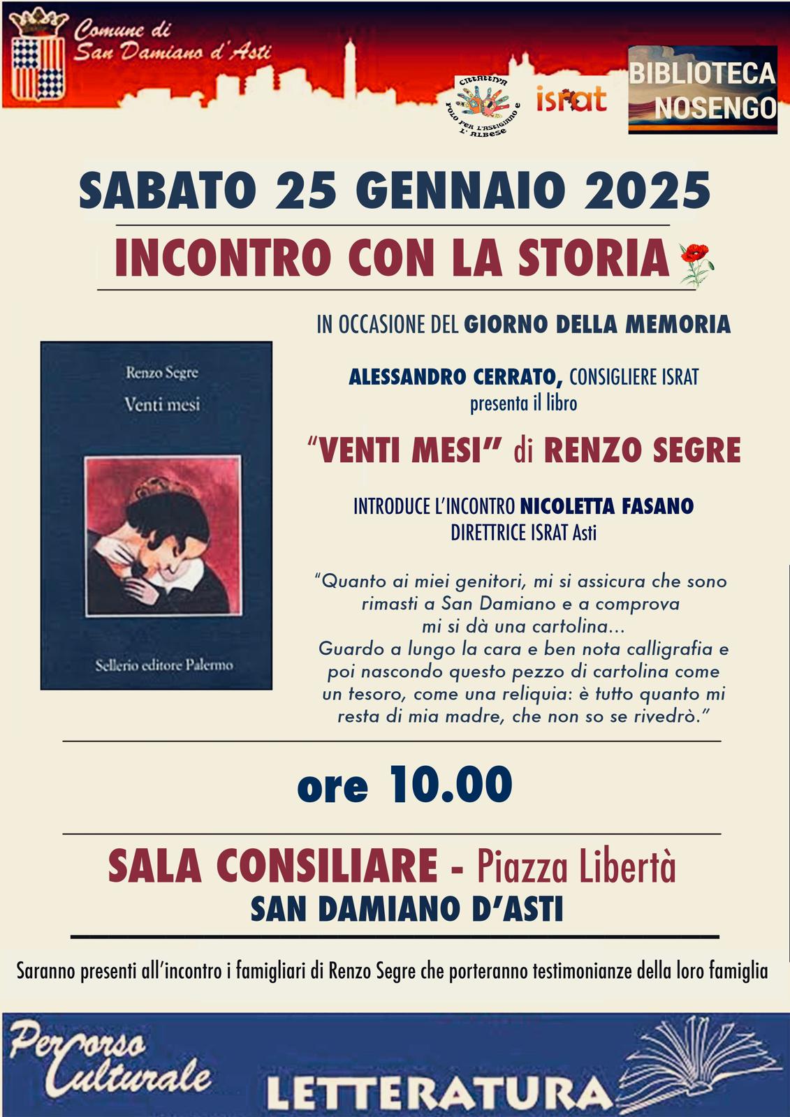 San Damiano - 25/01/2025 - Incontro con la storia Sabato 25 gennaio 2025 Incontro con la storia In occasione del Giorno della Memoria 2025 clicca sulla locandina a fianco per consultare il programma